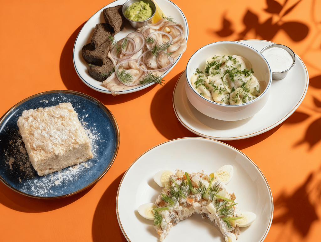На создание сета меня вдохновила классика русской кухни. Он начинается со строганины из атлантической скумбрии, продолжается фирменным «Оливье», затем — домашними пельменями. Завершает его десерт — «Наполеон». Это блюда, в которых традиция встречается с актуальным взглядом на вкус.