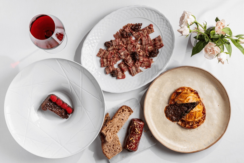 Тема России в гастрономии ассоциируется у меня в первую очередь с продуктами русского леса: сладкими ягодами и белыми грибами, которые стали прекрасным дополнением к блюдам европейской кухни. Закуски и горячее из сета прекрасно сочетаются с краснодарским Syrah Nikolaev&Sons, в котором, продолжая концепцию сета, сочетаются ноты малины, вишни и ежевики.