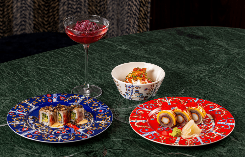 Затем — встреча морской свежести и южного солнца: тунец и креветка соединяются с манго в гармонии, полной света. В кульминации — ролл с вагю и фуа-гра.