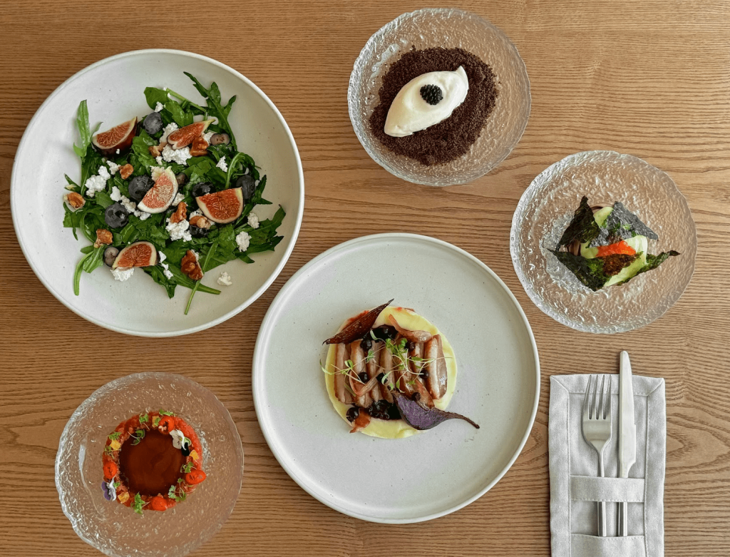 Этот сет блюд приглашает в путешествие по России. Столица: тартар из говядины с медово-цитрусовой заправкой. На юге — салат из рукколы с козьим сыром и инжиром. В Сибири — утка су-вид с трюфельным пюре. Десерт — кедровое мороженое. На востоке — брауни с кремом из нори и икрой.