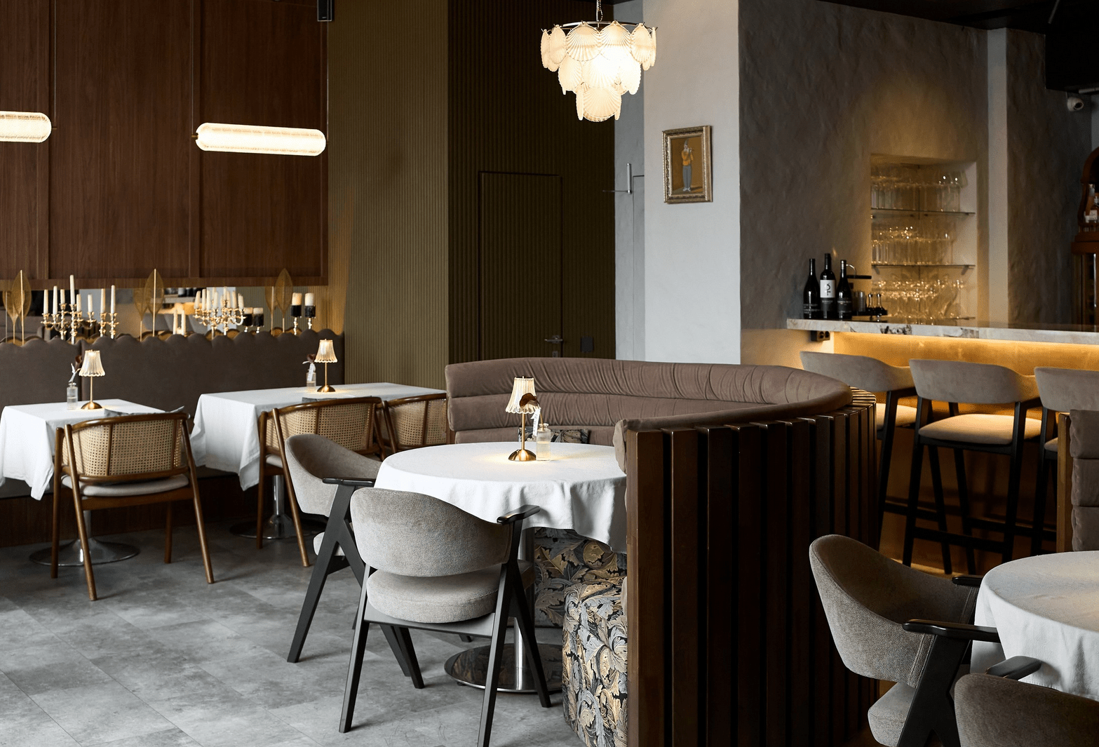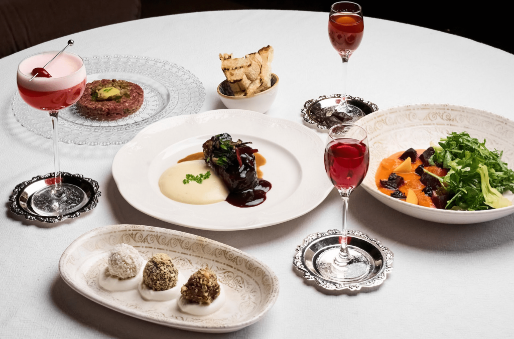 • Копчёная телячья щека с картофельным кремом и анчоусами: щёчка, копчёная на ольховых дровах, подаётся с нежным картофельным кремом с анчоусами и двумя соусами – насыщенным мясным и свежим смородиновым.